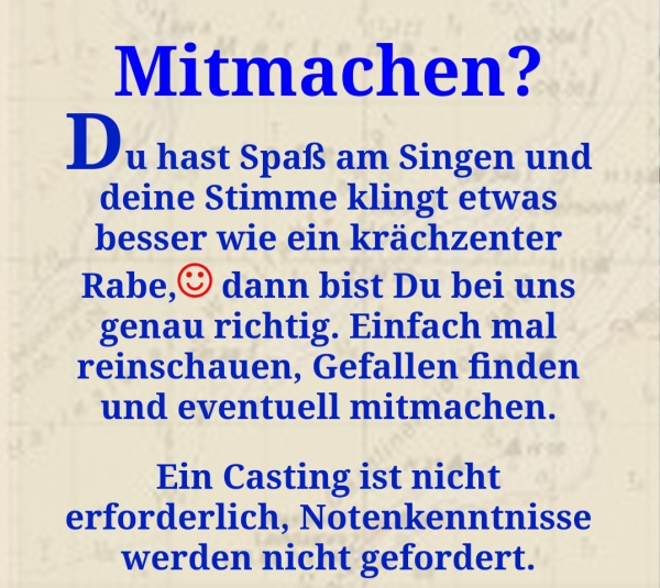 Ab 02.03.2026 führen wir wieder unsere vierzehntägige Proben durch.